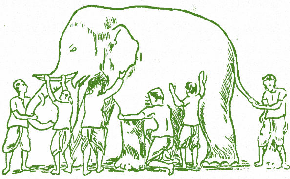 The Buddhist scripture, the verses of the Udana 68-69 of the Khuddaka Nikaya, the exclamations of the Buddha, narrates the story of the Blind Men of Sravasti. Disciples asked Lord Buddha why the wandering hermits and scholars constantly argued about so many issues and never seemed to come to any consensus. Lord Buddha then related a tale about a king, who ordered for all the blind men in the ancient city of Sravasti to be gathered together in front of an elephant. Each was given a specific part of the elephant to touch. Each of them perceived a different aspect of the elephant and assumed the elephant to have only the features that they personally understood: the head is like a pot, the ear is like a winnowing basket, the tusk is like a share, the trunk is like a plough, the foot a pillar, the back a mortar, the tail a pestle and the tuft of the tail a brush. However, what they did not realize is that all these physical attributes put together make the elephant.
